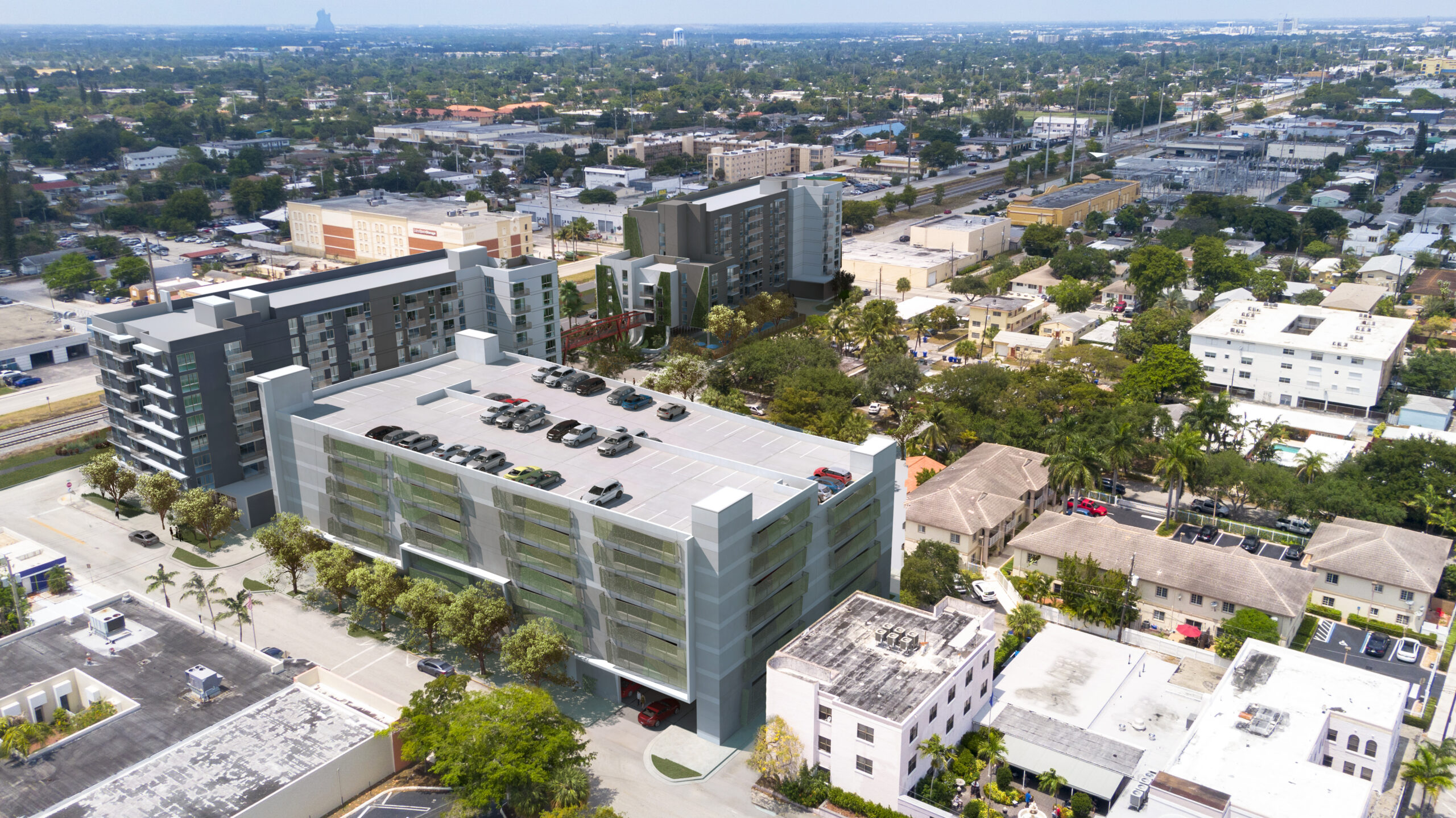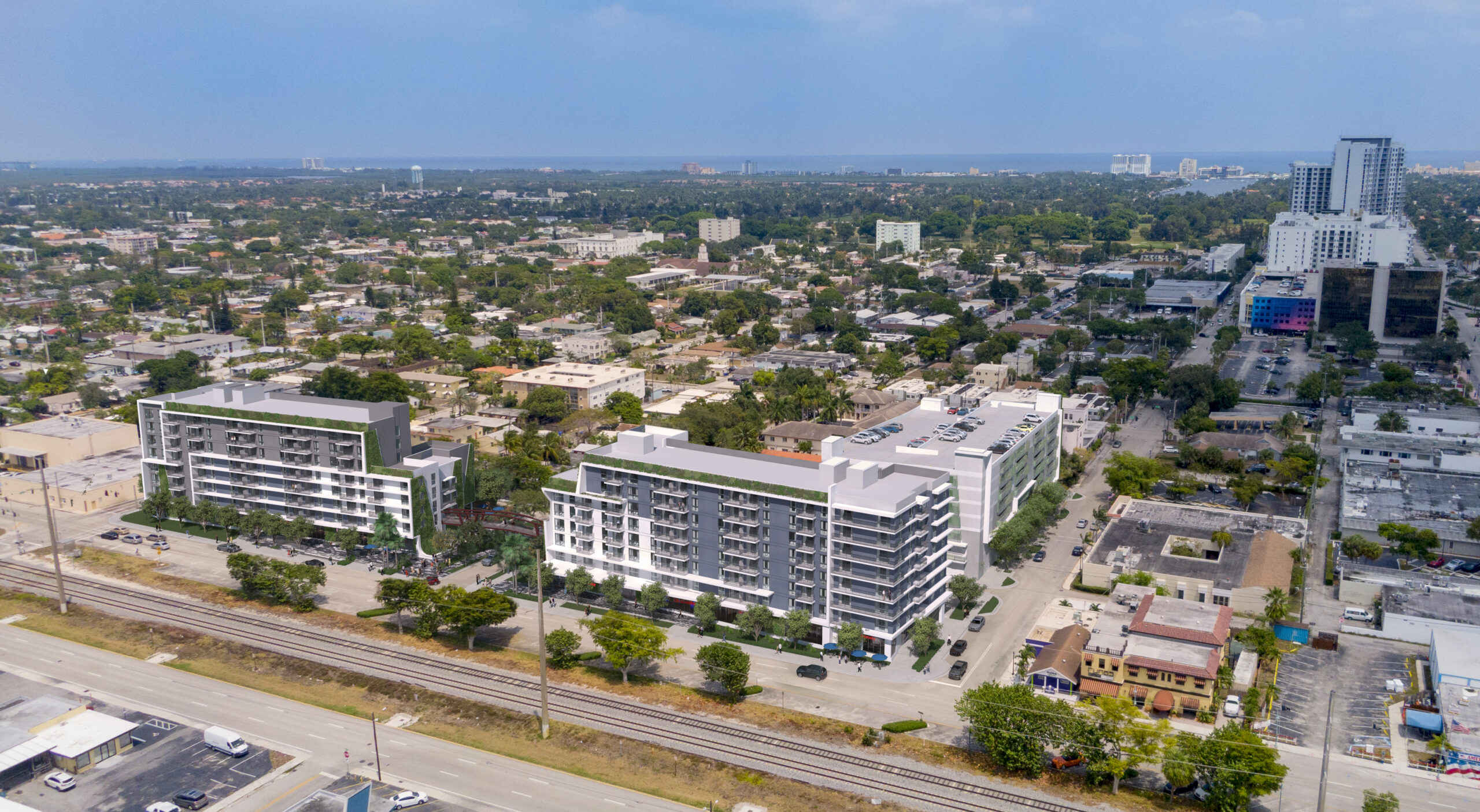 Located at 421 N 21st Ave, 309 N 21st Ave, and 2031 Polk Street, University Station will consist of three buildings, including two residential towers and a standalone, 635 space parking garage, of which 365 spaces will serve the Broward Commuter Rail South Station that is planned between Tyler and Taylor Streets, along the Florida East Coast (FEC) Railway.